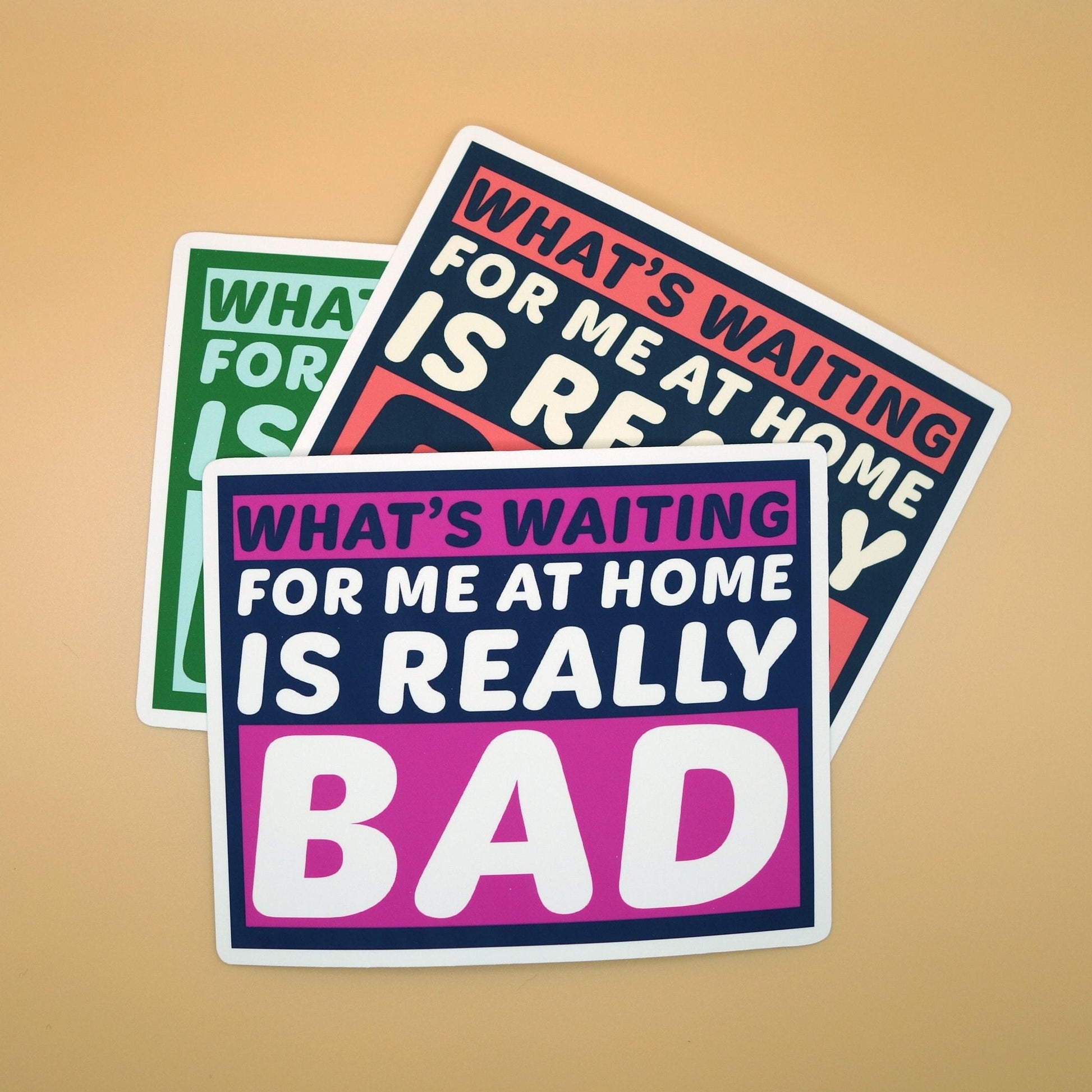 Capture the hilarity of "I Think You Should Leave with Tim Robinson" with our "What's Waiting for Me" Vinyl Matte Sticker. This sticker features the unforgettable line from Season 3 where Tim delivers the side-splitting line, "What's waiting for me at home is really bad." It's a humorous tribute to one of the most iconic moments from the show that has left audiences in stitches.