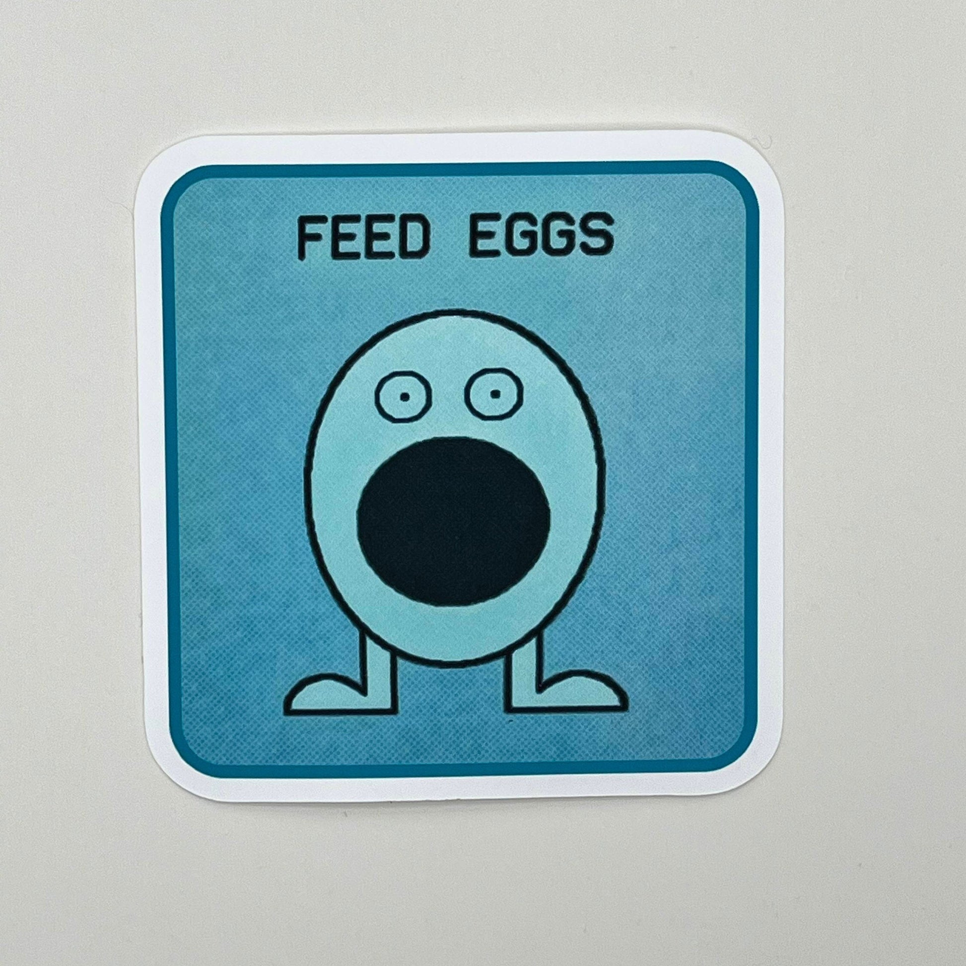 Crafted with meticulous attention to detail, this high-quality 3" vinyl matte sticker features the "Feed Eggs" title with an open-mouthed egg character, embodying the absurdity of the game's unexpected twist. It's a playful and nostalgic tribute to the comedic brilliance that has made the series a fan favorite.